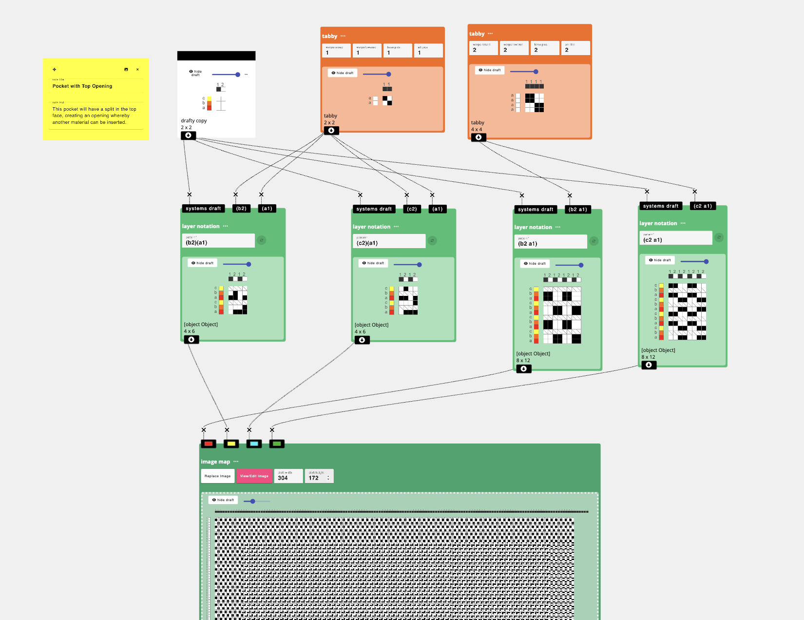 We'll just plan to have the conductive inserted into the region on the image map that is currently yellow (the bulk of the pocket). To do this, I'm also going to update the layer notation function to the pattern sequence (b2 d2)(a1 e1) to indicate that both systems b and d will weave on the top layer and systems a and e will weave on the bottom layer. Now, I need to create a draft that will map to systems a and e on the bottom and b and d on the top.