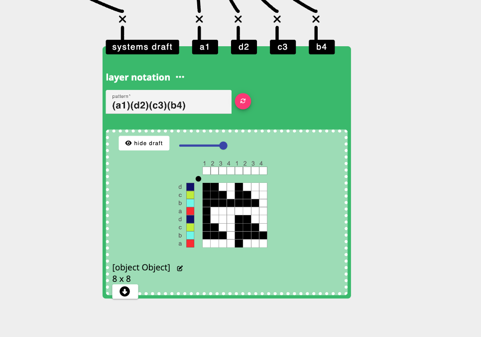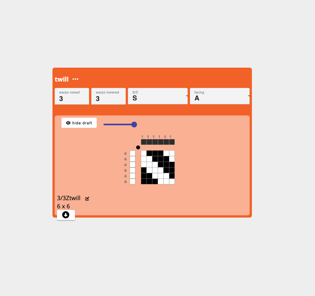 AdaCAD allows you to use parametric design to create woven structures and drafts. Specifically, the designer can make dataflows to produce drafts obey specific rules and relationships. They can play with the parameters within that dataflow to playfully explore variations and streamline edits. more...