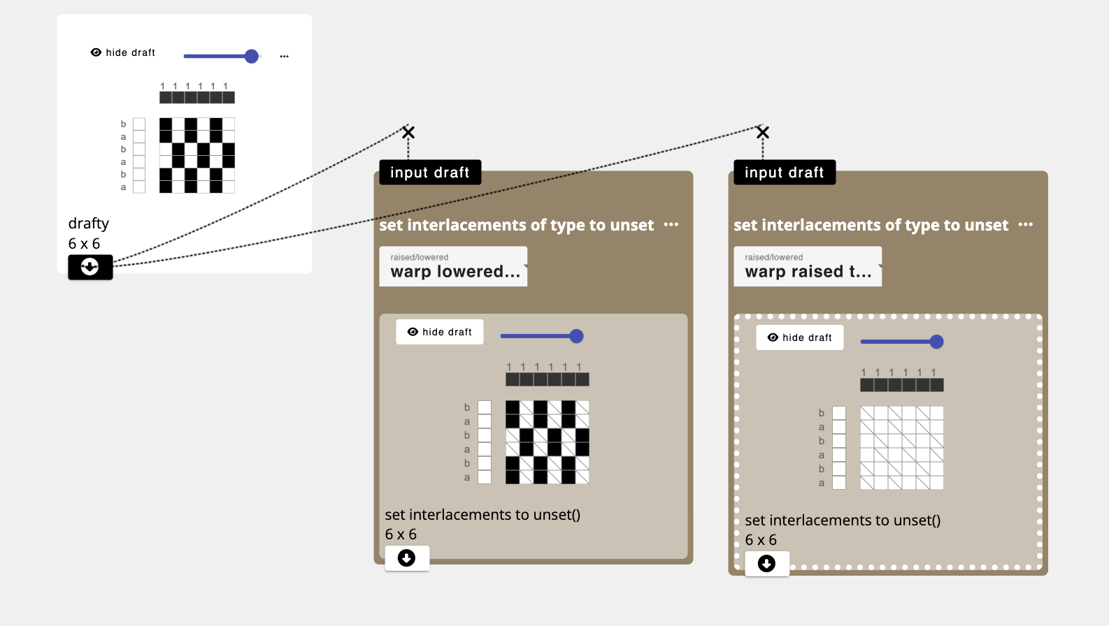 Unset cells allows someone to describe shaped or inlay elements in a cloth. Set interlacements of one type to unset will have the effect of specifying an area where no weft will travel